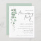 Budget Eucalyptus Script Anniversary Party Invitation. A budget price SMALLER 4.5” x 5.6” alternative. Available in a SEMI GLOSS 110 lb CARD STOCK which is the default option (recommended for invitations), OR a SATIN FINISH 80 lb THINNER PAPER STOCK (ideal for enclosures). Minimalist botanical style, with watercolor greenery flowing down on the left hand side and text to the right. A set handwritten script for Anniversary Party and the rest of the text you can easily personalise.