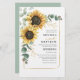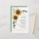 Create a modern Budget Eucalyptus Sunflower Wedding Invitation card with this cute template featuring beautiful rustic floral bouquet, geometric gold effect frame, with modern simple typography.