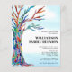 It features a colorful mosaic family tree on a watercolor background.