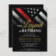 This design features a firemens flag with black and white stripes, and a thin red line stripe as well. "The Legend is Retiring" text sits above all of the party details for the retiring firefighter, lieutenant, or chief.