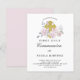 Very pretty First Communion invitation features a gold cross surrounded by blush pink roses and sage green leaves. Traditional fonts give this invitation a classic appearance.