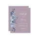 The left-hand edge of this romantic wedding invitation features a watercolor floral bouquet of dusty blue flowers and greenery. The customizable text combines white handwriting, copperplate and italic fonts on a mauve background. The reverse side is a coordinating solid mauve.