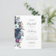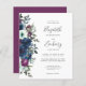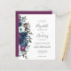 The left-hand edge of this romantic wedding invitation features a watercolor floral bouquet of plum purple and navy blue flowers and greenery. The customizable text combines handwriting, copperplate and italic fonts in charcoal grey on a white background. The reverse side is a coordinating solid plum.