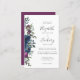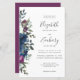 The left-hand edge of this romantic wedding invitation features a watercolor floral bouquet of plum purple and navy blue flowers and greenery. The customizable text combines handwriting, copperplate and italic fonts in charcoal grey on a white background. The reverse side is a coordinating solid plum.