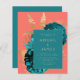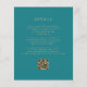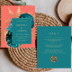 This elegant wedding invitation features a lush, romantic floral bouquet in teal blue with gold faux foil and glitter foliage on a coral background. Customize the gold-colored text in stylish fonts on a teal rectangle. The reverse side provides space for wedding details on a solid teal background, along with a QR code guests can scan to visit your website and RSVP, which saves the cost of printing and mailing separate RSVP cards.
