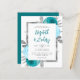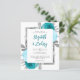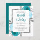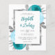 This design features lush bouquets of turquoise and silver flowers adorning a silver faux foil rectangular frame. Customize the text on a white background with the first names of the bride and groom in modern turquoise handwriting script, with the date, time and wedding venue in charcoal grey sans serif font. The back of the card is a matching shade of solid turquoise.