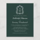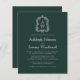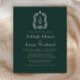 This elegant vintage-inspired wedding invitation design features a pair of white monogram initials in open serif font above and below a dividing line and encircled by a line art acanthus crest on a dark forest green background. The back of the card is solid forest green.