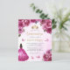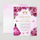 This lovely quinceañera invitation features a border of fuchsia pink roses on a pink watercolor background. A gold tiara, a dark-haired girl in a fuchsia princess dress and small pink butterflies decorate the text. The word "Quinceañera" and the name of the guest of honour appear in elegant gold-coloured handwriting script, with the remaining text in grey sans serif font.