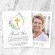 An elegant budget-friendly funeral and memorial thank you card featuring a watercolor illustration of a simple gold cross inside a gold geometric wreath adorned with sage green eucalyptus greenery and "Thank You" in a sage green calligraphy script. Personalize your thank you message and add an inspirational quote or bible passage. On the reverse side, add a photo of your loved one, their name and birth and death dates.