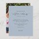 Future Mrs Photo Bridal Shower Dusty Blue Thanks. A budget price SMALLER 4.5” x 5.6” alternative. Available in a SEMI GLOSS 110 lb CARD STOCK which is the default option (recommended for invitations), OR a SATIN FINISH 80 lb THINNER PAPER STOCK (ideal for enclosures). Envelopes are an optional extra and are slightly larger than the card size. The Future Mrs is in a playful artsy set script with ring and heart motifs and the rest of the text you can easily personalise. Replace the sample photo on the back with a fun picture from your event.