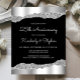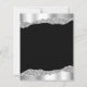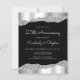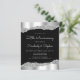 This trendy 25th wedding anniversary party invitation features sparkly silver faux foil and glitter top and bottom borders on a black background. The words "25th Anniversary" and the first names of the couple appear in casual silver gray handwriting script, with the rest of the customizable text in sans serif font. The same silver foil and glitter border design appears on the reverse side.
