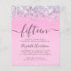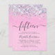 Budget-friendly pretty and girly 15th birthday party invitation with sparkly holographic purple, pink and silver faux glitter confetti against a pink background and "fifteen" in a soft grey trendy script with swashes.