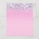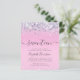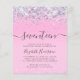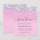 Budget-friendly glamourous and girly 17th birthday party invitation with sparkly holographic purple, pink and silver faux glitter confetti against a pink background and "seventeen" in a soft grey trendy script with swashes.