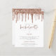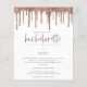 Budget Rose Gold Glitter Drip Bachelorette Weekend Invite. A budget price SMALLER 4.5” x 5.6” alternative. Available in a SEMI GLOSS 110 lb CARD STOCK which is the default option (recommended for invitations), OR a SATIN FINISH 80 lb THINNER PAPER STOCK (ideal for enclosures). Envelopes are an optional extra and are slightly larger than the card size. The main header Hen Party is in a rose pink set script typography and the rest of the text you can easily personalise, as well as your itinerary details on the reverse.