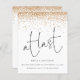 A value for money BUDGET alternative on a smaller size 4.5 x 5.6” semi-gloss 110lbs weight, which is of similar thickness to a postcard (however is not suitable to use as a postcard.). PLEASE NOTE there is ONE invite per sheet. Budget Gold glitter Confetti At Last Engagement Announcement. A stylish set typography in black for At Last complementing the rest of the text which you can easily personalise, with a border of faux glitter confetti at the top on both sides.