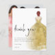 Budget Gold Gown Photo Auburn Haired Girl Quinceañera Thank You. A budget price SMALLER 4.5” x 5.6” alternative. Available in a SEMI GLOSS 110 lb CARD STOCK which is the default option (recommended for invitations), OR a SATIN FINISH 80 lb THINNER PAPER STOCK (ideal for enclosures). Elegant style for your 15th birthday party thank yous with the backview of a girl with auburn red hair in a beautiful sparkly gold dress to the right, and Thank You in a set handwritten style script. Easily personalise the rest of the text to your own details. Replace the sample photo on the back with a favourite from your party.