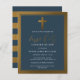 Elegant first holy communion invitations featuring a faux gold cross, border, and script on a navy blue background. As part of the budget selection here on Zazzle, these invitations do not come with envelopes nor do they fit snugly in a standard-sized envelope. The closest size is A6 but there will be a gap of approximately half an inch. If you don't mind the lack of snugness you could use such widely available A6 envelopes. Otherwise, this design can be transferred to a standard 5x7 format (which comes with envelopes) using the design transfer tool. As a rough guide, as of the time of writing, 100 budget invitations (including a volume discount) would cost around $39 whereas 100 standard 5x7 invites including envelopes would cost approximately $135. Your mileage may vary depending on Zazzle's available promo codes, site-wide sales, or changes in pricing.