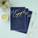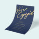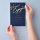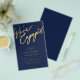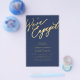 Simple minimal chic whimsical faux gold calligraphy dark navy blue we're engaged script BUDGET AFFORDABLE engagement party invitation PAPER FLYER (advertising type of paper suitable for folded mailings). ++++++++++++++++ PLEASE READ THIS BEFORE PURCHASING! This is a low budget wedding invite printed on a FLYER. ++++ Please note that BUDGET PAPER IS THIN - You can upgrade to have this card printed on cardstock ++++ ENVELOPES NOT INCLUDED. +++ Double-check all the information and spelling of your text because you will receive exactly what you see - no one else will check anything before printing. ++++ This card is designed for size 5.5" x 8.5".