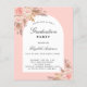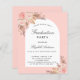 An arch frame decorated with rose gold and blush pink florals, roses and pampas grass. Personalize and add a name and details.