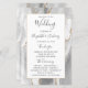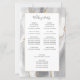 This elegant, modern wedding program fan features a gray and white agate background trimmed with gold faux glitter. The text appears in elegant charcoal gray handwriting and copperplate fonts on a white rectangle.