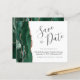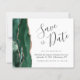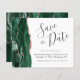This elegant budget save the date card features an emerald green watercolor agate border trimmed with faux rose gold glitter. The customizable text combines charcoal grey handwriting script, copperplate and italic fonts on a white background. The reverse side features a matching emerald green and rose gold agate design.