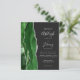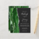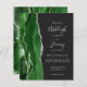 The left-hand edge of this elegant modern wedding invitation features a hunter green watercolor agate border trimmed with faux silver glitter. The customizable text combines handwriting, copperplate and italic fonts in light silver grey on an off-black background. The reverse side features a matching green and silver agate design.