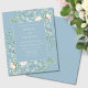 Elegant sophisticated watercolor greenery frame with peach roses and eucalyptus leaves. Elegant modern geometric border. Cute calligraphy. Dusty blue background. Shades of green, pink, peach. Subtle and elegant wedding design.