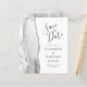The left-hand edge of this elegant modern wedding save the date card features a grey and white watercolor agate border trimmed with faux silver glitter. The customizable text combines charcoal grey handwriting, copperplate and italic fonts on a white background. The reverse side features a matching grey and silver agate design.