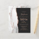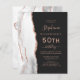The left-hand edge of this elegant modern 50th birthday party invitation features a grey and white watercolor agate border trimmed with rose gold faux glitter. The customizable text combines rose-coloured handwriting, copperplate and italic fonts on a slate black background. The reverse side features a matching agate design.