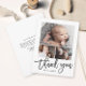 This 3 photo baby thank you note features modern calligraphy thank you in white with large customer photo. The interior includes a generic thank you message that you can personalize for each guest or remove it altogether if you prefer to hand right your thank you. Click edit to customize.