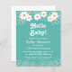This gender-neutral baby shower budget invitation is decorated with daisies and stylish typography on a teal turquoise background.