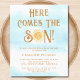It features the text "Here Comes The Son" in stylish brown typography with a cute yellow watercolor sun and a blue sky background.