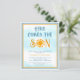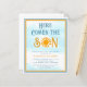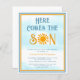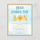 Invite family and friends to your sun-themed baby shower with this budget boys' baby shower invitation. It features the text "Here Comes The Son" in stylish retro typography with a yellow watercolor sun on a blue sky background. Easily customizable. Because we create our artwork you won't find this exact image from other designers. Original Watercolor © Michele Davies.
