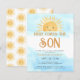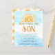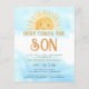 Invite family and friends to your sun-themed baby shower with this budget boys' baby shower invitation. It features the text "Here Comes The Son" in stylish typography with a cute yellow watercolor sun on a blue sky background. The back is decorated with a smiling sun pattern. Easily customizable. Original Watercolor © Michele Davies.