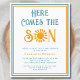 Invite family and friends to your sun-themed baby shower with this budget-friendly boy's baby shower invitation. It features the text "Here Comes The Son" in stylish retro typography with a yellow watercolor sun. Easily customizable. Original Watercolor © Michele Davies.