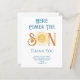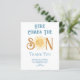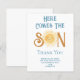 This budget boy's baby shower thank you card features the text "Here Comes The Son" in blue retro typography with a smiling yellow watercolor sun. Easily customizable. Original Watercolor © Michele Davies.