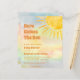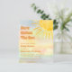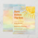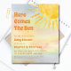 This budget baby shower invitation is decorated with a hand-painted sun and "Here Comes The Sun" in stylish retro typography on a colourful watercolor background.