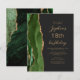 This elegant modern birthday party invitation features a hunter green watercolor agate border trimmed with gold faux glitter. The customizable text combines gold-colored script and sans serif fonts on a slate black background. The reverse side features a matching green and gold agate design.