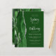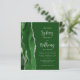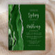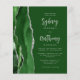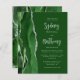 The left-hand edge of this elegant modern wedding invitation features a hunter green watercolor agate border trimmed with faux silver glitter. The customizable text combines light silver grey calligraphy script and sans serif font on a hunter green background. The reverse side features a matching green and silver agate design.