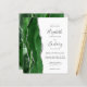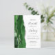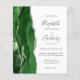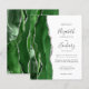 The left-hand edge of this elegant modern wedding invitation features a hunter green watercolor agate border trimmed with faux silver glitter. The customizable text combines handwriting, copperplate and italic fonts in charcoal grey on a white background. The reverse side features a matching green and silver agate design.