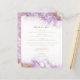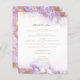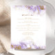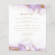 This elegant modern wedding menu features a lavender watercolor marble border trimmed with faux gold foil. The customizable text combines gold-coloured script with serif font. The reverse side features a matching lavender and gold marble design.
