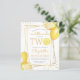 This citrus themed lemonade second birthday party invitation features a gold geometric frame adorned with watercolor lemons. The word "TWO" appears in yellow capital letters with a watercolor lemon slice in place of the "O." Add your little sweetie's name and birthday in modern yellow handwriting script and the party details in charcoal grey sans serif. The back of the card is solid yellow. An ideal theme for a summer birthday party!