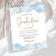 This trendy graduation party invitation features a top and bottom border of watercolor agate geode in shades of light blue with faux gold glitter highlights. The word "Graduation" appears in faux gold glitter in decorative modern handwriting font. Customize the invitation with the name of the graduate in gold colored text and the party details in charcoal gray on a white background. A matching light blue and gold agate image appears on the reverse side.