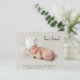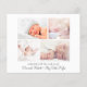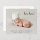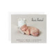 Minimal budget-friendly 5 photo birth announcement. Your newborn's photo fills the front and is overlayed with "he's here!" "she's here!" or "I'am here!" in a contemporary script (you can move this text to another area on the card to suit your photo by selecting "customize further"). Add his or her name, arrival date and birth stats. On the back, add four additional family photos, a "welcomed by" message and the parent's and sibling's names.