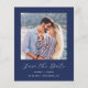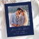 This simple, minimalist Save the Date card features a square photo above the words "Save the Date" in elegant white handwriting script, followed by the couple's names, wedding date and city in sans serif font on a navy blue background. Add a more detailed message with additional information on the reverse.