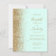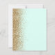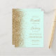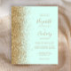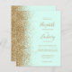 The left-hand edge of this elegant modern wedding invitation features a gold faux glitter border. The customizable text combines gold-coloured handwriting, copperplate and italic fonts on a pastel mint green background. The reverse side features a matching mint green and gold glitter design.
