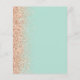 The left-hand edge of this elegant modern wedding invitation features a peach faux glitter border. The customizable text combines dark peach handwriting, copperplate and italic fonts on a mint green background. The reverse side features a matching mint green and peach glitter design.