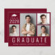 Budget-friendly minimal modern burgundy red graduation announcement featuring a 4 picture photo collage, "Graduate" written in large white letters and his or her class year, name and school or university in simple white typography.