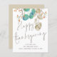 Modern Autumn Foliage Happy Thanksgiving .A budget price SMALLER 4.5” x 5.6” alternative in a SEMI-GLOSS 110 lb CARD STOCK, similar to the thickness of a postcard. Envelopes are slightly larger than the card size. Artsy autumnal leaves in autumnal blues, creams and browns are at the top, with trendy handwriting style set typography for Happy Thanksgiving. Easily personalise your names and greeting at the bottom. A coordinating cream is on the back.