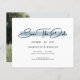Budget Modern Minimalist Script Save The Date Invitation Card features "Save The Date" in an elegant black script over a modern blue accent on a white background with your Save The Date information below. Personalize by editing the text in the text boxes provided and adding your favourite photo to the reverse. Designed for you by ©Evco Studio www.zazzle.com/store/evcostudio